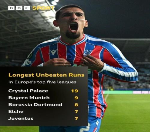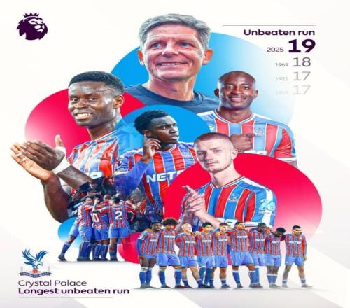 歐協杯第2輪,比賽后段10打11的水晶宮2比0戰勝基輔迪那摩,第31分鐘穆尼奧斯首開紀錄,第58分鐘恩凱蒂亞再下一城,博爾納·索薩第74、76分鐘連吃兩黃。 水晶宮贏得隊史首場歐戰勝利,跨賽季連續19場不敗,超越1969年18場不敗,刷新隊史紀錄;格拉斯納的球隊也是目前五大聯賽連續不敗場次最多的,其后是拜仁的9場不敗。 水晶宮上一次輸球是今年4月16日,客場0比5紐卡斯爾聯;本賽季各項賽事11場不敗(5勝6平,點球大戰算平局),在英超積分榜高居第3位。