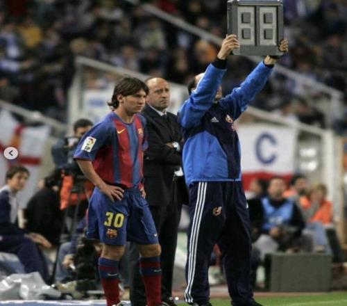 2004年10月16日,西甲第7輪,巴薩客戰西班牙人,梅西于第82分鐘身披30號球衣替補登場,完成一線隊正式比賽首秀。