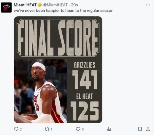 北京時(shí)間10月18日,NBA季前賽,熱火125-141慘敗灰熊。這場比賽熱火是被逆轉(zhuǎn)的,前三節(jié)打完熱火都領(lǐng)先灰熊,但末節(jié)兩隊(duì)第三陣容的比拼灰熊一波39-22打崩熱火,最終灰熊在客場拿到勝利。