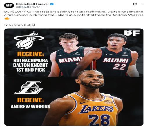 根據(jù)湖人記者約什-布哈的消息,熱火對威金斯的要價(jià)是湖人一個(gè)未來不保護(hù)的首輪簽、道爾頓-克內(nèi)克特、八村壘,也就是要1換3,他們也真的要的出口。